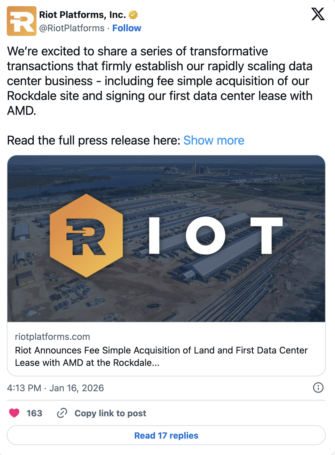 “I am pleased to report the significant progress we have made, which expands our fully approved data center power portfolio to 1.7 GW and, through the execution of our lease agreement with AMD, firmly establishes Rockdale as a leading development hub. This partnership validates Riot’s infrastructure, expansion capabilities, site attractiveness, available power capacity, and our ability to deliver innovative solutions to meet the needs of premier tenants,” said Riot CEO Jason Les.